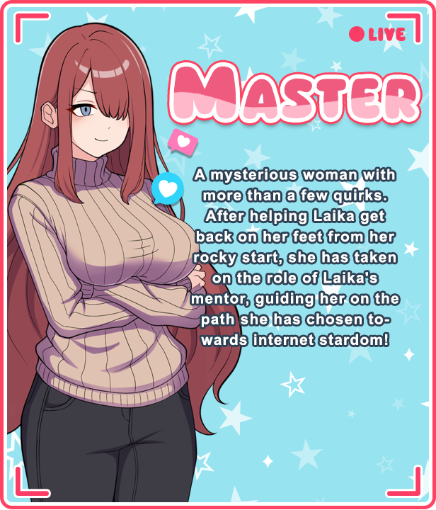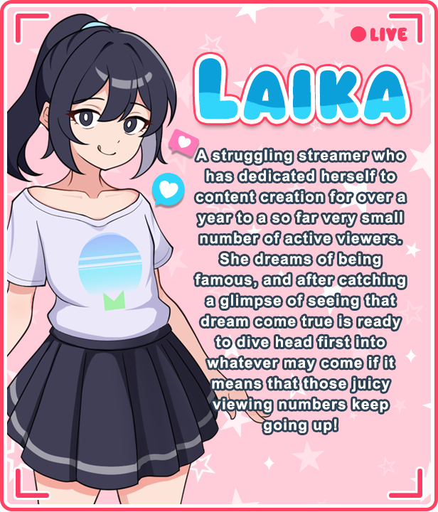 Play as Laika, by managing her day-to-day activities. Brainstorm new ideas by going around the city to find inspiration, make videos, interact with viewers on stream, post pictures for your community to enjoy, and build Laika’s community through her social media!